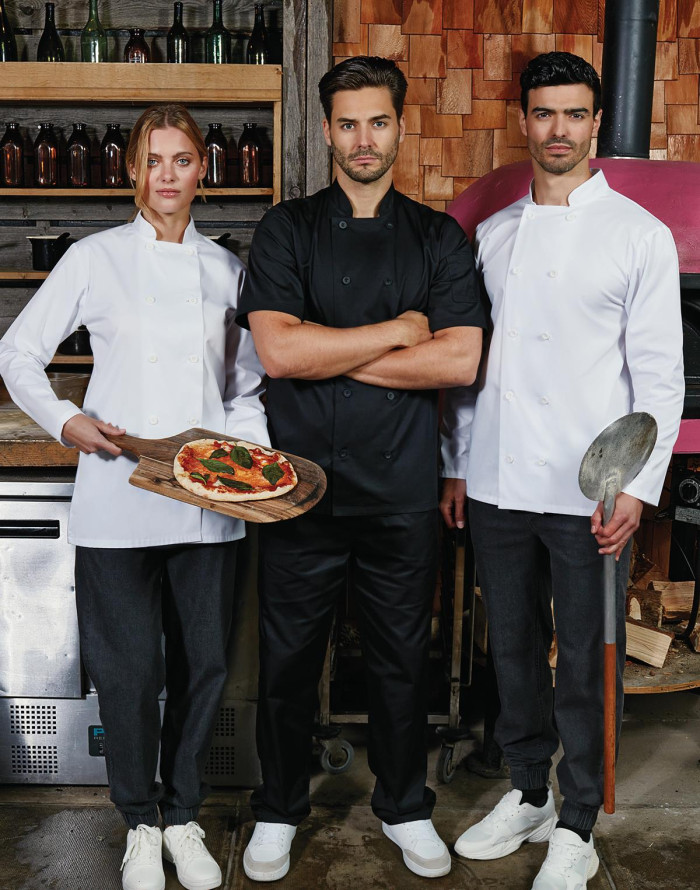 Pavāru jaka ar garām piedurknēm. Aptverams modelis ar desmit pogu aizdari priekšpusē, kā arī noderīgu pildspalvas kabatu kreisās rokas augšdaļā.