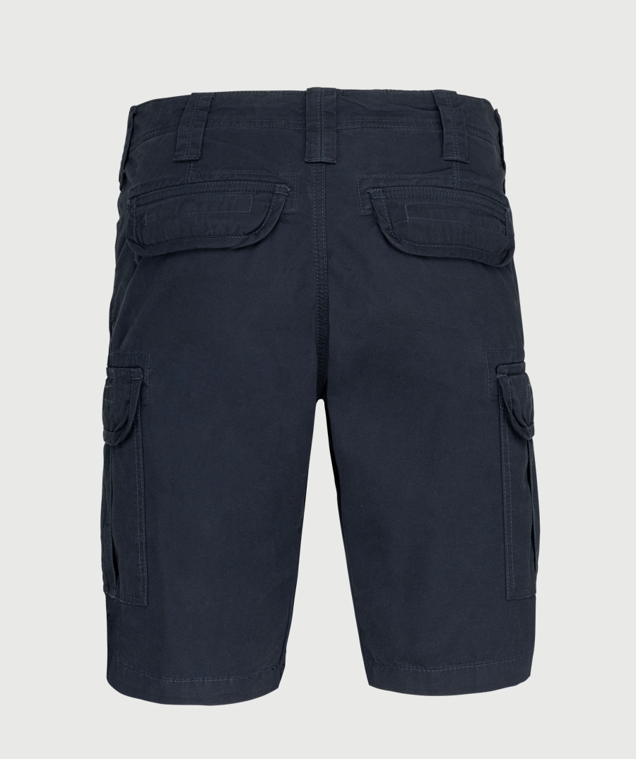 Divas dziļas sānu kabatas, divas kabatas ar pārlokiem aizmugurē. Uz abām kājām kabatas ar līplentas aizdari. Jostas cilpas.
